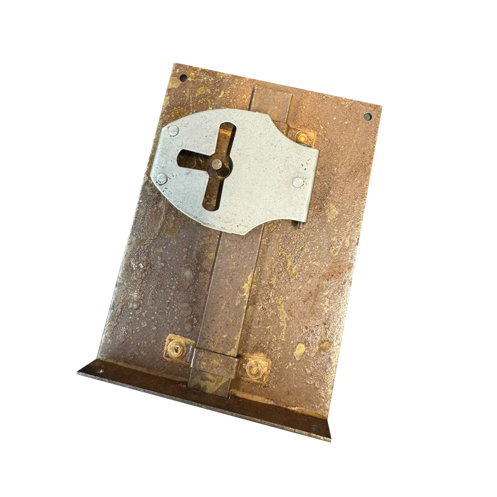 Realizzata in ferro con finitura arrugginita, si integra perfettamente in ambienti rustici, vintage o artigianali, dove ogni dettaglio racconta una storia. Il foro piccolo per la chiave richiama le serrature d’epoca, discrete e affidabili.
