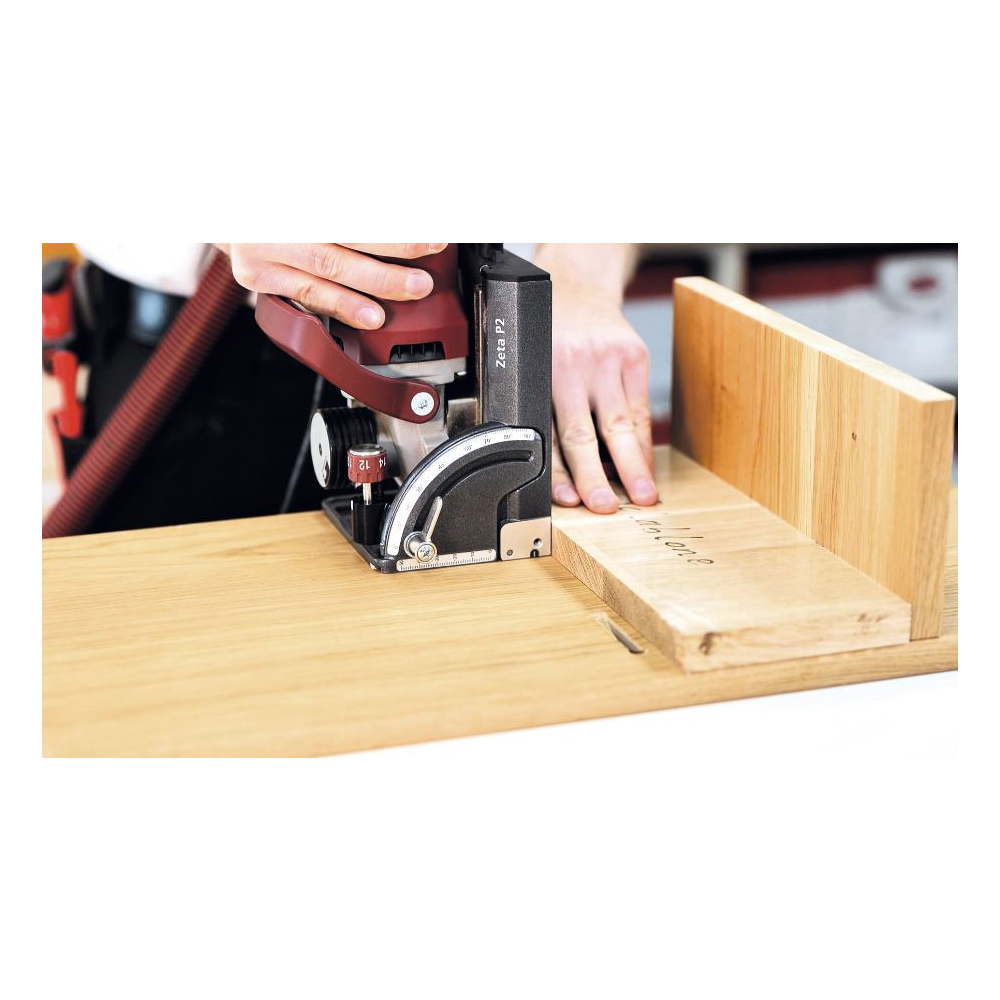 La fresatrice Zeta P2 con meccanismo di lavorazione verticale integrato crea la scanalatura a interblocco per P-System in pochi secondi. Dopo la penetrazione nel materiale, il meccanismo di lavorazione verticale si attiva automaticamente ed esegue un movimento assiale della fresa per la scanalatura per P-System. La struttura e l'applicazione della macchina si basano sul collaudato sistema Lamello caratterizzato da battute puntuali. Offre quindi gli stessi vantaggi: elevata qualità di lavorazione per una precisione perfetta, nessuna regolazione di profondità tra la lavorazione dei due pezzi, gioco laterale degli elementi di giunzione e quindi azionamento del movimento di lavorazione verticale. Con la fresa a scanalare Zeta P2 e le giunzioni P-System adatte è possibile eseguire una regolazione rapida delle giunzioni angolari. Il meccanismo di sollevamento automatico è sicuro, completamente meccanico, affidabile e a usura ridotta. È costituita da pezzi torniti ad alta precisione di Lamello, genera una corrente parassita che consente di unire i pezzi in modo rapido, estetico e con qualsiasi angolazione. Il regolatore di profondità P-System consente una rotazione ultraveloce per l'impostazione di diverse profondità per gli elementi di giunzione P-System: 10, 12, 14, 15 o 18. Oltre all'applicazione P-System, Zeta P2 può essere utilizzata come fresatrice standard per l'utilizzo con lamelle in legno. Ancora più efficiente è l'impiego della fresatrice per tasselli piatti Zeta P2 in combinazione con un centro di lavoro CNC. Sul centro di lavoro CNC vengono praticati fori di posizionamento che forniscono alla Zeta P2 dotata di perni di posizionamento la posizione esatta per la fresatura di scanalature sulla superficie o sul bordo.
