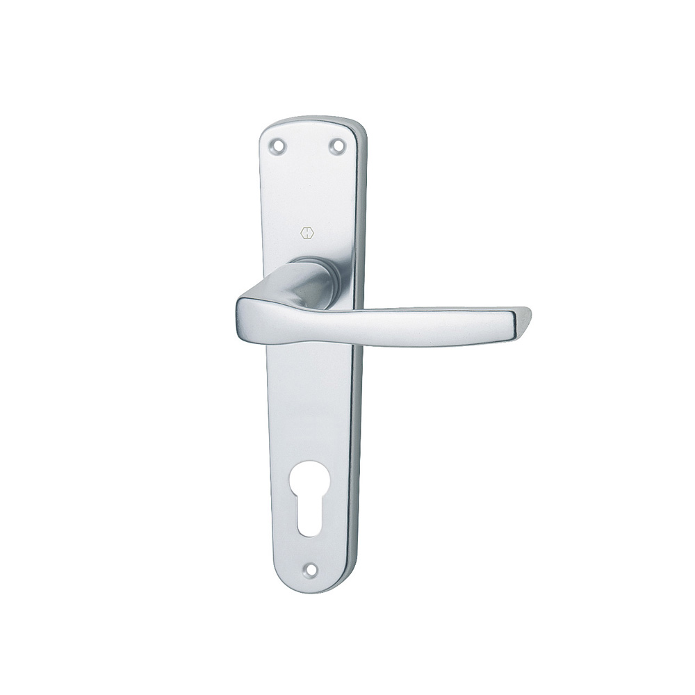 Realizzata in ottone e rifinita con una finitura argento, questa maniglia è resistente e durevole, mantenendo un aspetto impeccabile nel tempo grazie alla sua superficie che resiste ai graffi e ai segni di usura. La placca con foro Yale è progettata per ospitare serrature a cilindro europeo, garantendo la massima sicurezza per le tue porte, mentre il design ergonomico della maniglia permette una presa comoda e sicura.
