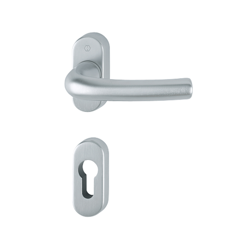 La maniglia Tokyo con rosetta e bocchetta ovale Yale, firmata HOPPE, unisce estetica moderna e funzionalità elevata in un unico elemento di design. Il suo profilo lineare ed essenziale si abbina perfettamente alla finitura cromo satinato, donando alla porta un aspetto sobrio ma elegante, ideale per ambienti contemporanei e minimalisti.