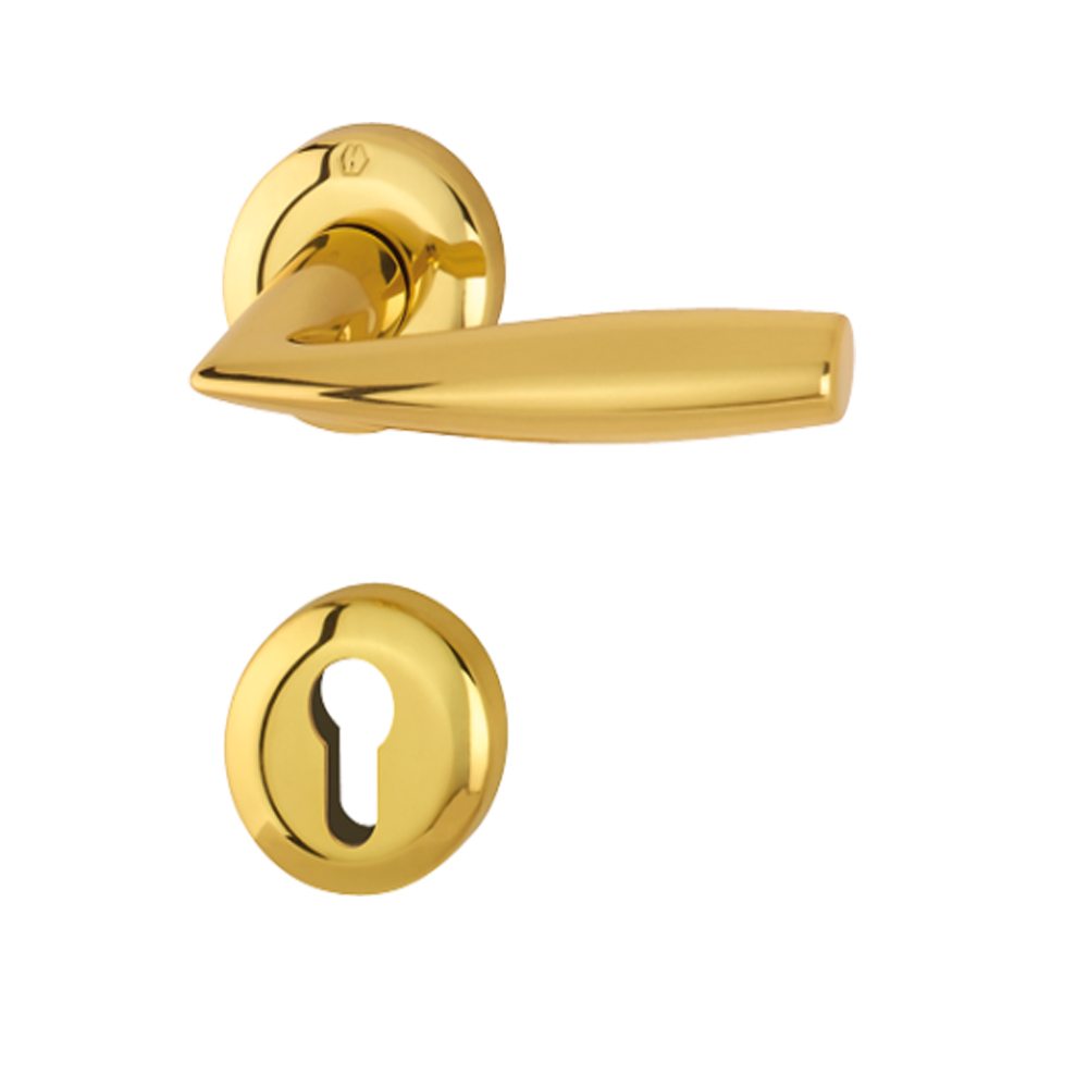 La bocchetta Yale, abbinata alla rosetta tonda, consente l’installazione su porte con serratura a cilindro europeo, mantenendo coerenza visiva e funzionale. La brillantezza della finitura in ottone lucido dona alla porta un tocco distintivo e autorevole.