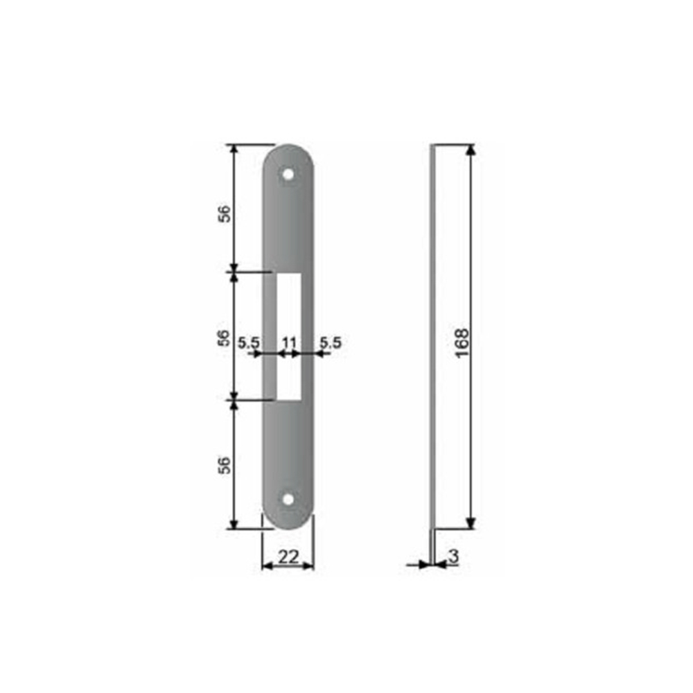 Incontro per serratura di sicurezza con dimensioni 22x168 mm, bordo tondo, solo scrocco, realizzato in ottone verniciato. Garantisce precisione, stabilità e resistenza all’usura, ideale per applicazioni su infissi e mobili.