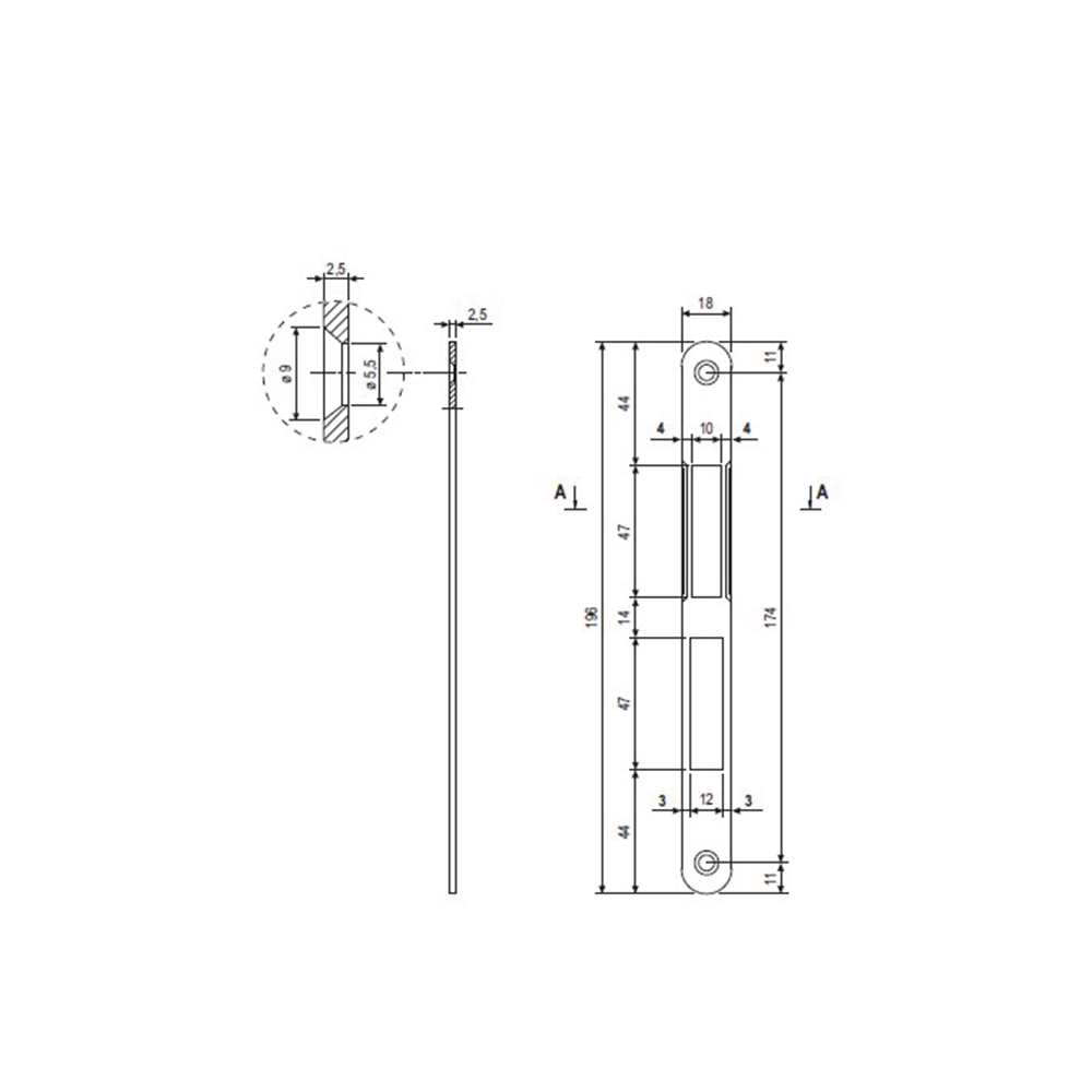 Incontro per serratura centrale progettato per l’alloggiamento di scrocco e catenaccio, ideale per infissi e serramenti che richiedono una chiusura sicura e precisa. Le dimensioni 18x196 mm assicurano compatibilità con i principali sistemi di serratura centro.