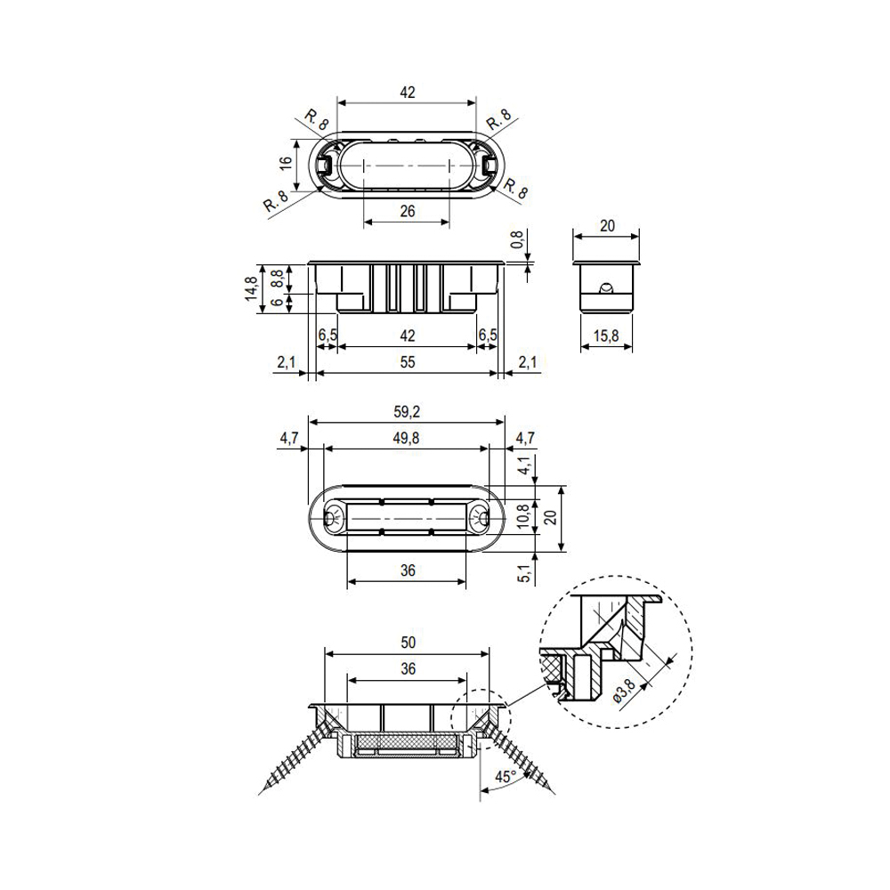 Incontro in nylon con bordo tondo, larghezza 18 mm, lunghezza 57 mm. Design minimalista e lineare che lo rende quasi impercettibile sul telaio della porta. Registrabile in pressione fino a 1,5 mm mediante rotazione di 180° dell’incontro.